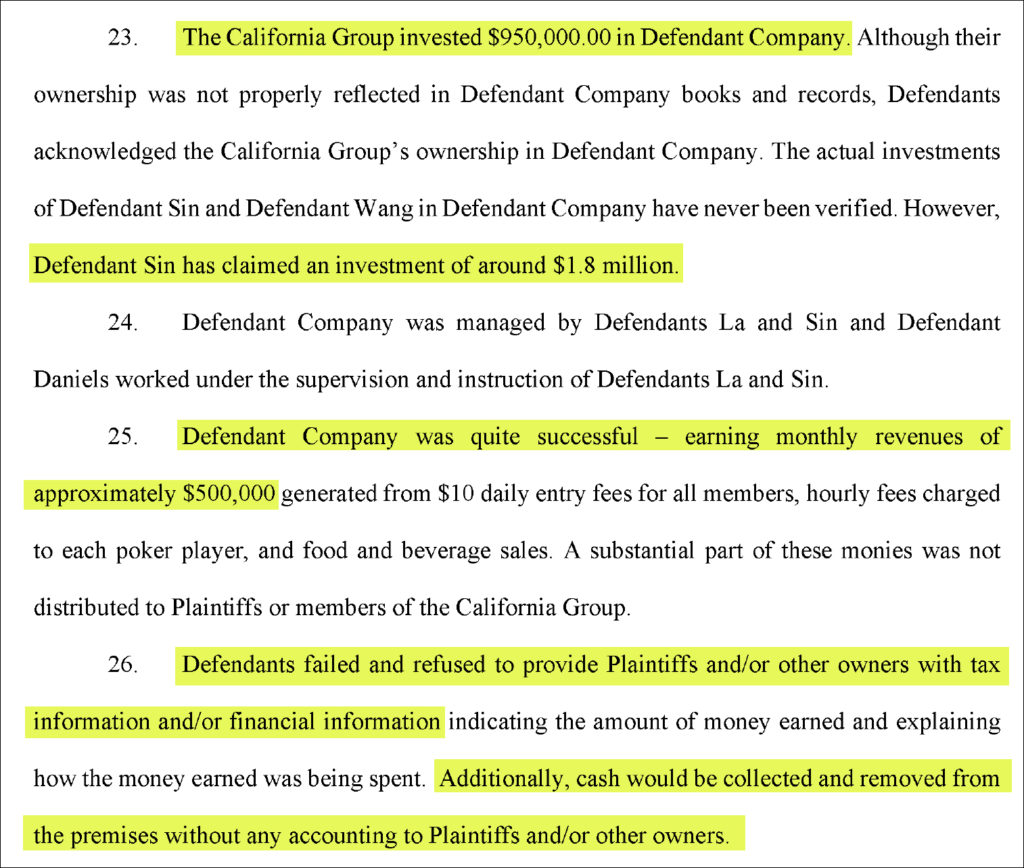 To review, who exactly is Legends Poker Room? This lawsuit points to David La, Ho Jun Sin, Jie Wang, Mike Daniels, JJJ Vision LLC dba 52 Social. The group is referred to in the lawsuit as the “Defendant Company.” You can find details on this group throughout this website. We invite you to check out the depths of the issues that surround this ownership “cabal,” as we believe it should be referred to.