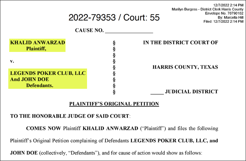 Legends Poker Houston has been hit with a blockbuster lawsuit that goes to the very ownership of the embattled poker room on Richmond Ave.